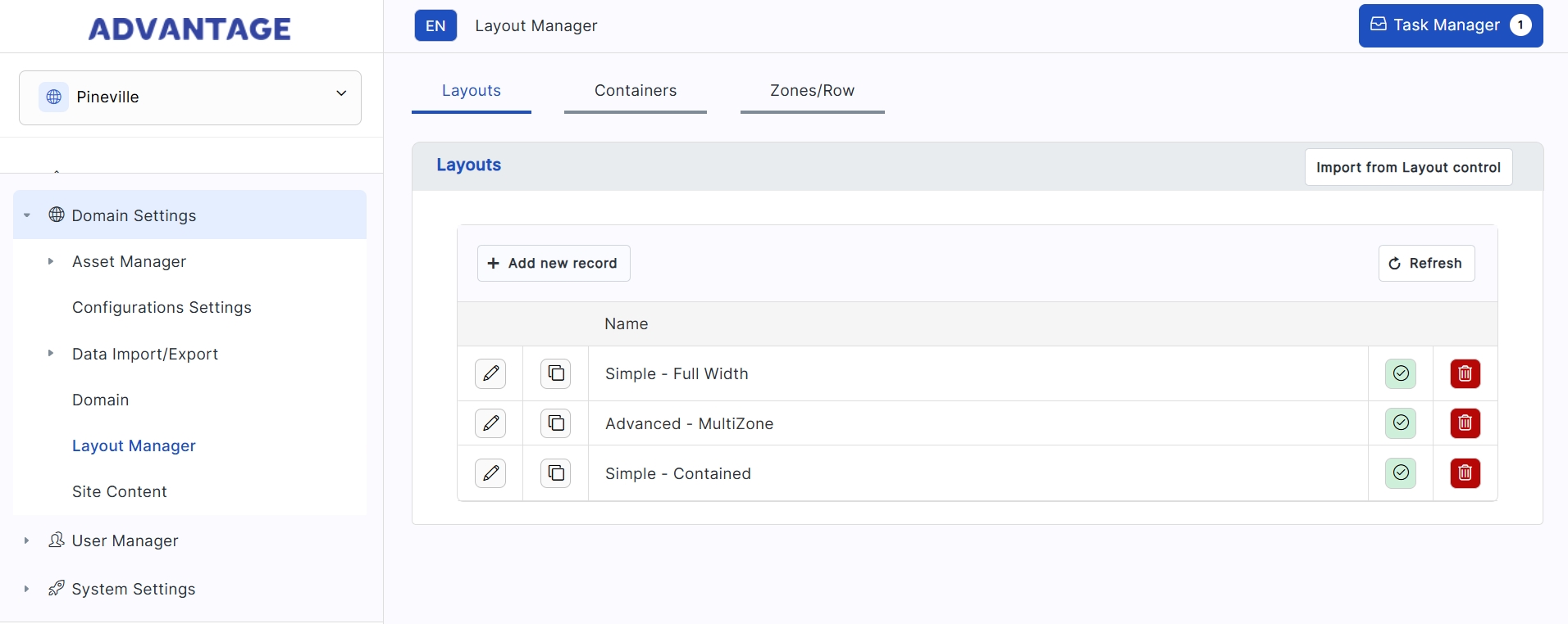 Introduction The Layout Manager in Advantage is a robust tool equipped with three tabs for configuring various elements of your website’s structure, each designed for specific functionalities. Layouts: This tab allows for the addition or importation of different layouts, toggling their active status, and editing them with ease. You can also duplicate any layout using the copy function. Layout Builder: Adding a new layout is intuitive with the Layout Builder, where you can craft a custom layout by dragging and dropping the Container and Row widgets into the work area, designing your page structure visually. Containers: In the Containers tab, you can create a new container by naming it and specifying the Tag Name, along with any CSS Classes and Inline Styles you require. Save your updates to make the container available for use on your site. Zones: To establish Zones, you’ll start by creating a zone container. Simply fill in the necessary fields, then save your updates. These Zones will then be ready to organize and display content on your pages as designated areas within the layout. Layouts 1. Click on Domain Settings to expand the menu. 2. Click on Layout Manager. 3. Click on Layouts. 4. Click on Add new record. 5. Or Clone and existing layout as a starting point. 6. Click Edit. 7. Now you can access the drag and drop Layout Builder. 8. Click on Container and drag it into the Template Layout where you want it to go. 9. Click on Row and drag it into the Template Layout where you want it to go. 10. Click on View HTML. 11. View the code. Click Ok to close. 12. View the Properties of a Zone by clicking the pencil icon. The Properties window opens, where you can edit and update the Zone Container or Zone/Row. 13. Click on In-line Scripts. 14. Click on Add new record. 15. Enter a Script Name. 16. Check Active. 17. Choose the Page Location. 18. Add your script in the Script Editor. 19. Click on Css Files. 20. Choose whether to Combine Scripts. 21. Click on Add new record. 22. Select a Render location. 23. Set a Url/Location. 24. Click Update, and then Save. 25. Click on Javascript Files. 26. Choose whether to Combine Scripts. 27. Click on Add new record. 28. Select a Render location. 29. Set a Url/Location. Click Update, and then Save. 30. Go to the Page Manager and select your new layout. 31. Use the dropdown to select your Layout. Adding Styling to Containers 1. Click on Domain Settings to expand the menu. 2. Click on Layout Manager. 3. Click on Containers. 4. Click on Add new record. 5. Give the Container a Name. 6. Set the Tag Name. 7. Add CSS Classes. 8. Click on Inline Styles. 9. Click on Update, and then Save. Zones and Row 1. Click on Domain Settings. 2. Click on Layout Manager. 3. Click on Zones/Row. 4. Click on Add new record 5. Give the Zone a Name. 6. Click on Tag Name. 7. Click on Container CSS Classes. 8. Click on Container Inline Styles. 9. Click on Tag Name. 10. Click on Zone Css Classes. 11. Click on Zone Inline Styles. 12. Click on Update, and then Save.